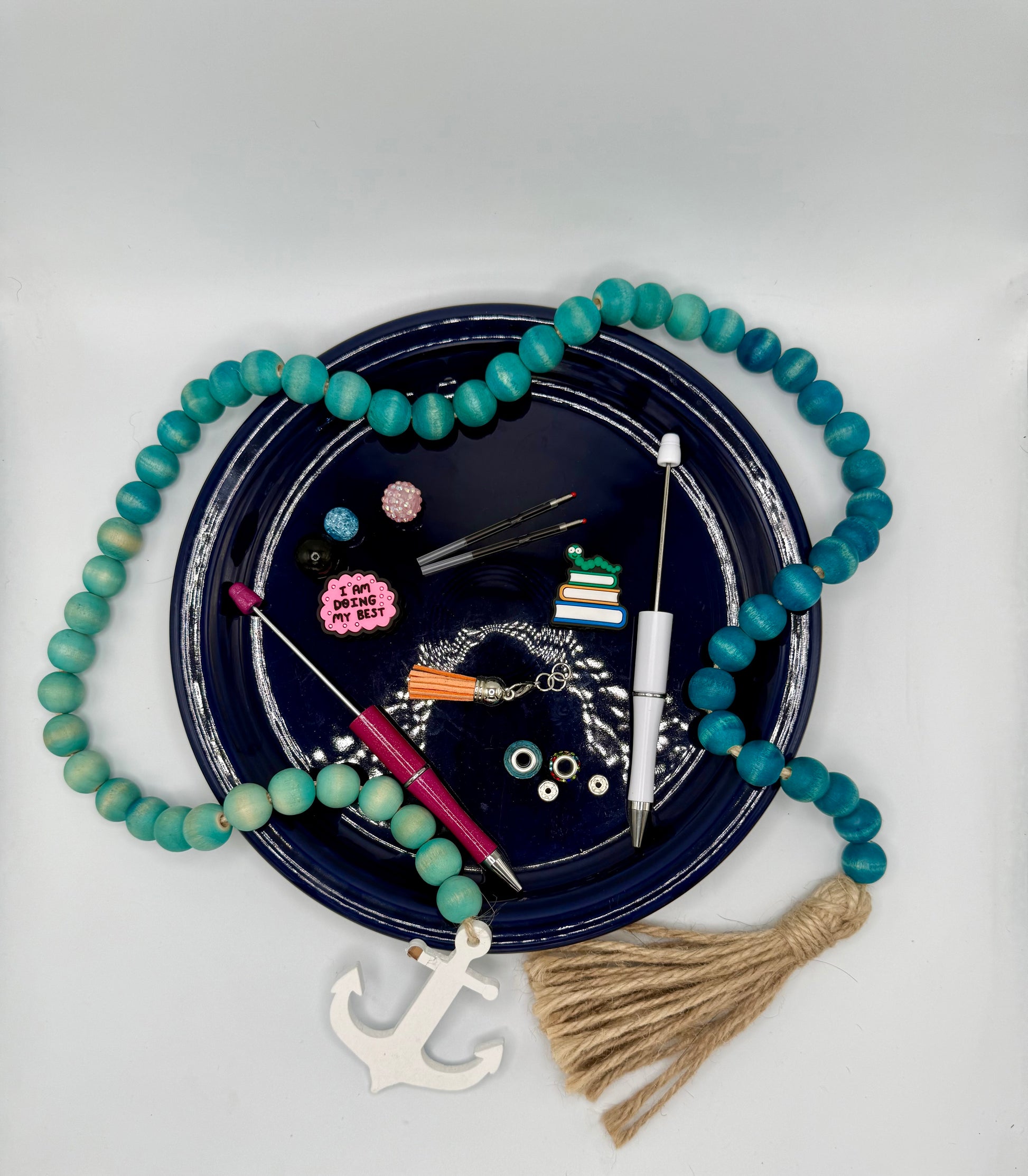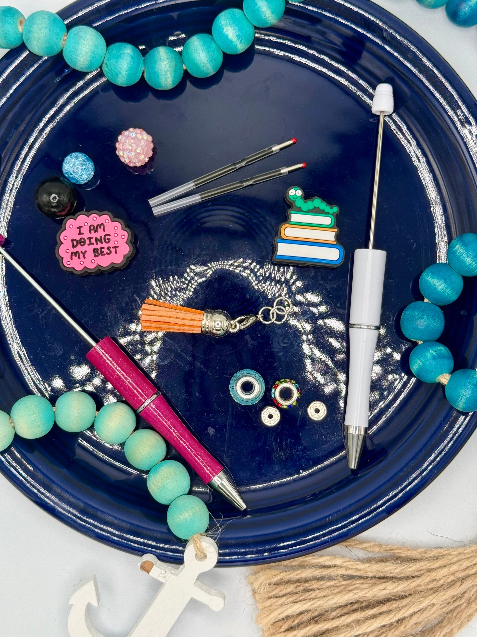The "Doing My Best" pen bead kit includes bubblegum beads, a pink pen, and a white pen, enhanced with book worm and "I Am" focal beads for a personalized design. Spacers allow for precise bead placement, while refill inks keep your pens writing smoothly. This kit is designed for creating expertly crafted, meaningful pens with lasting quality.