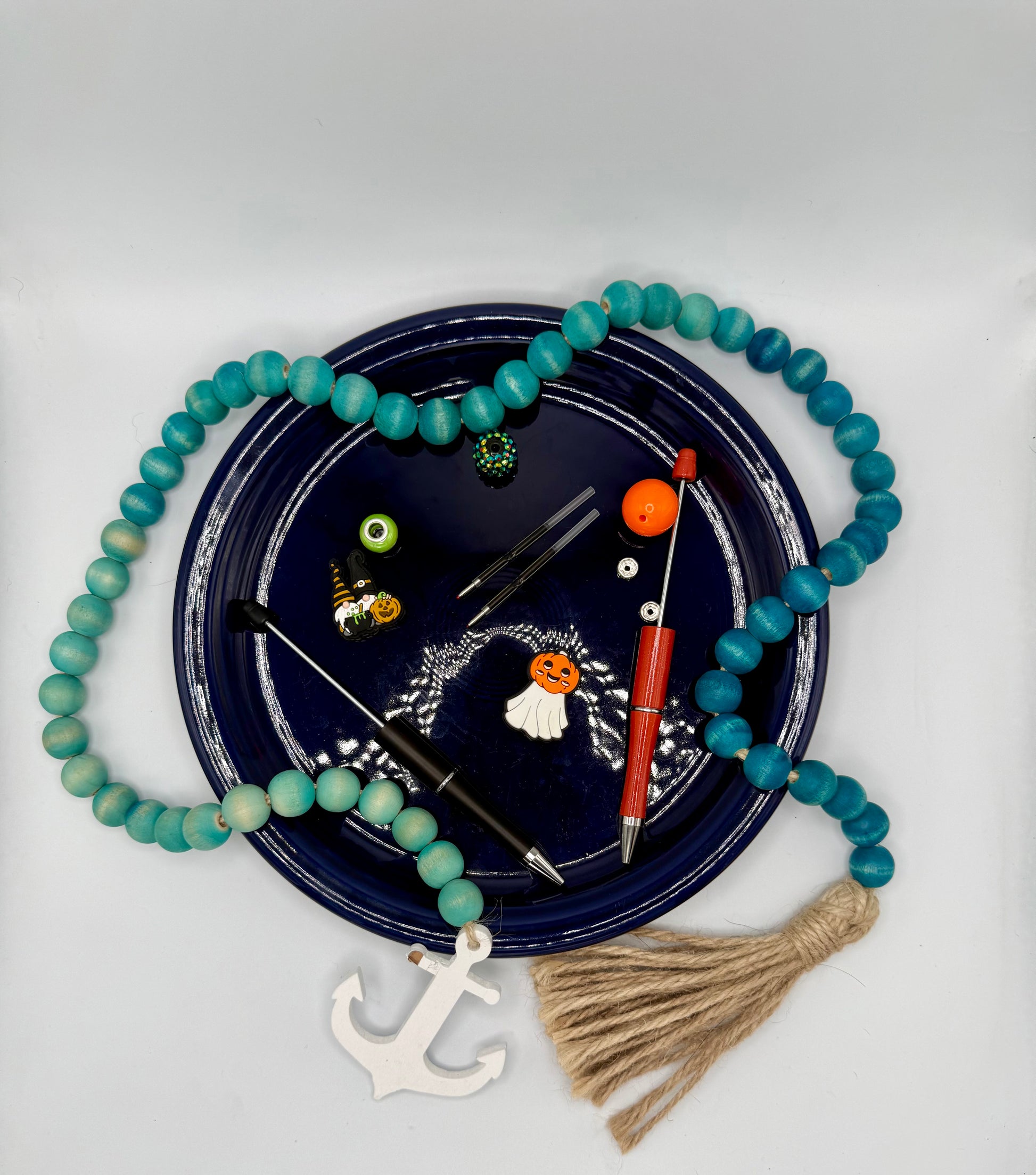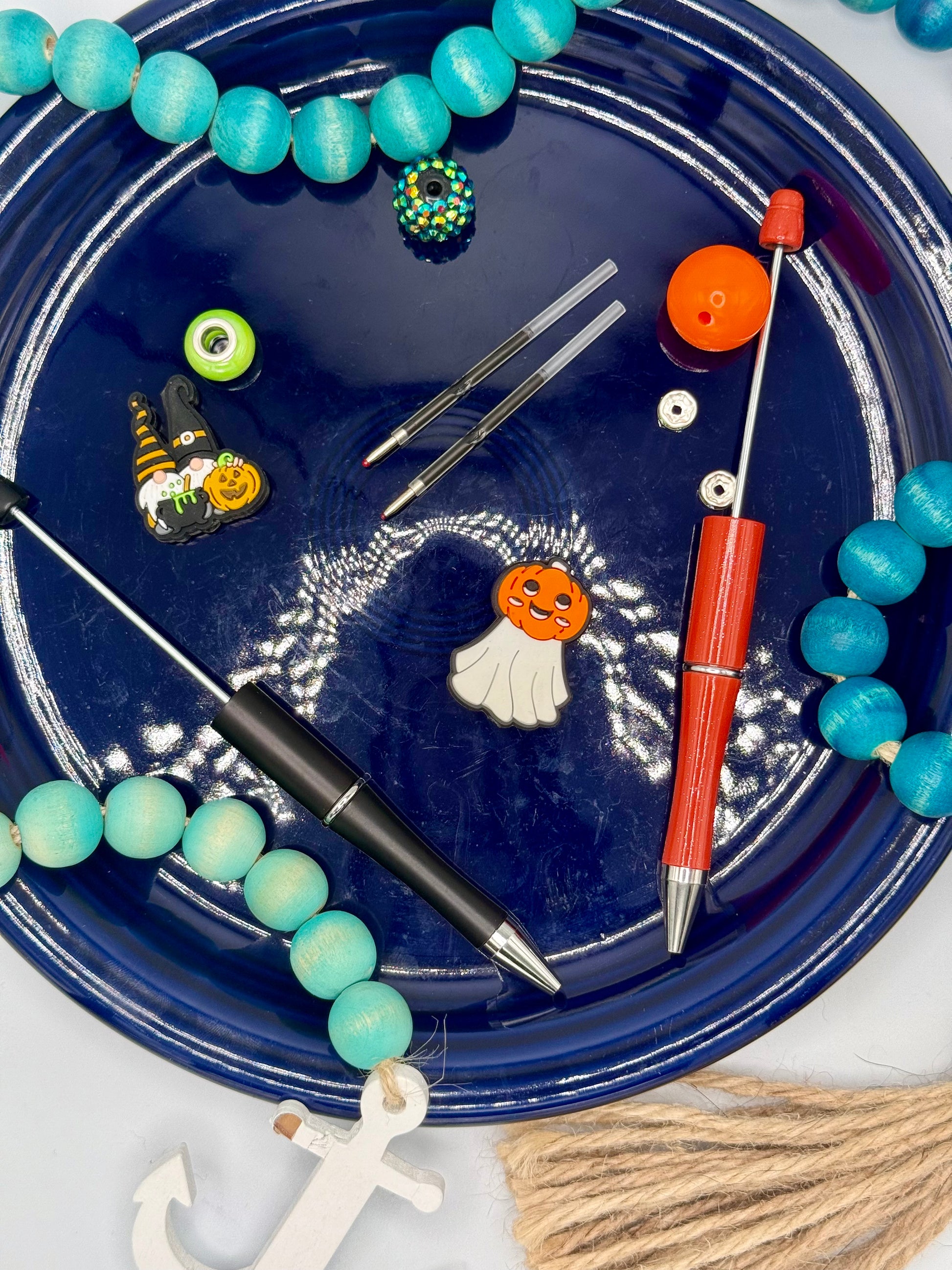 Create festive Halloween-themed pens with the Spooky Gnomes Beaded Pen Kit. This expert kit includes orange and black pens, gnome and pumpkin ghost focal beads, spacers, bubblegum beads, and ink refills. Perfect for crafting unique, seasonal writing tools that combine playful design with smooth functionality. Ideal for hobbyists seeking detailed, themed projects.