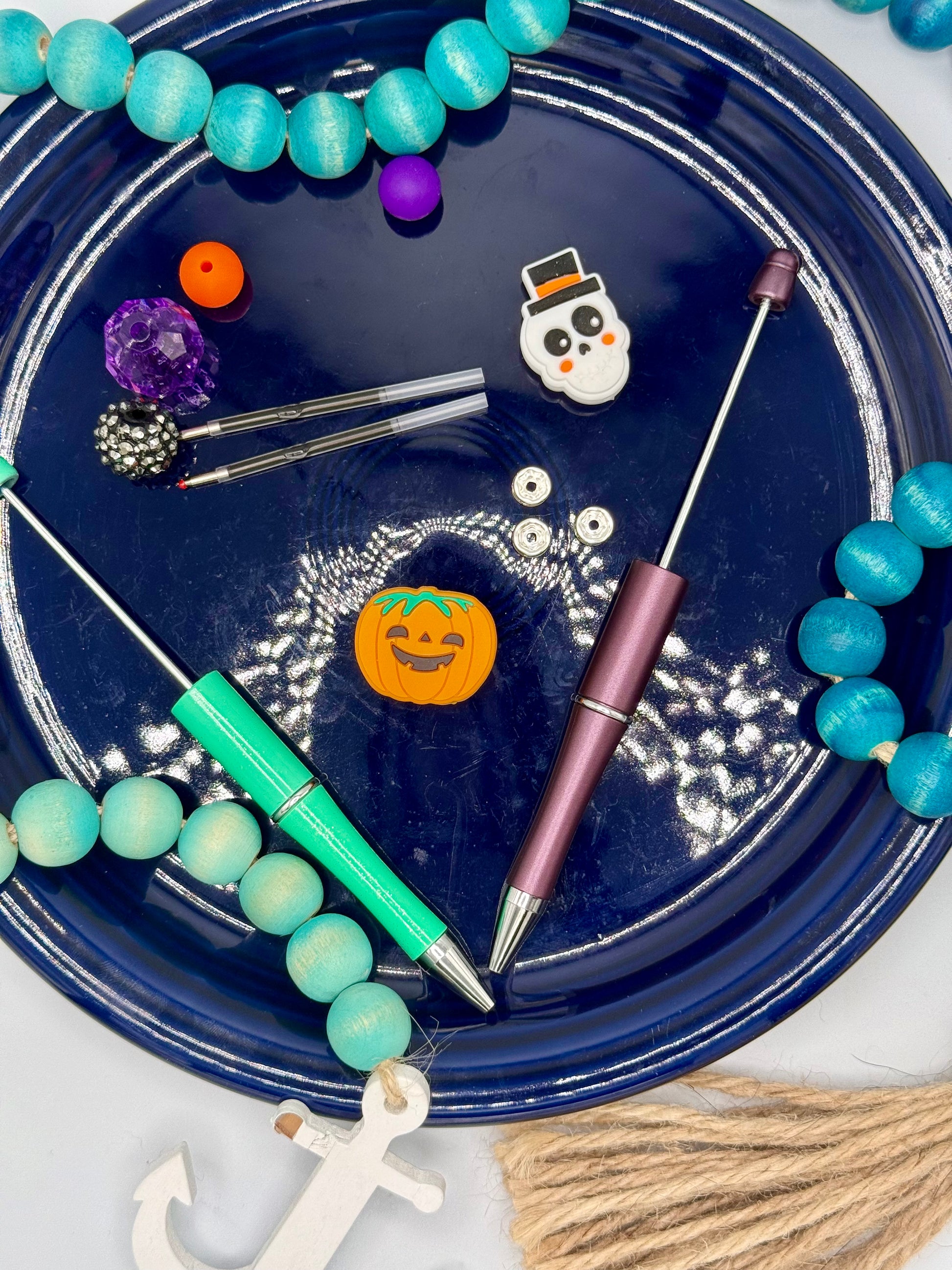 The Mr. Bones Pumpkin pen kit combines expert craftsmanship with a spooky Halloween theme. Featuring a green and purple pen body, each kit includes a skull and pumpkin focal bead, complemented by coordinating spacers and a bubblegum bead for a unique, festive look. Designed for smooth writing, the kit also comes with an ink refill to ensure lasting use. Perfect for collectors or those seeking a distinctive seasonal accessory, this kit offers both style and functionality in one package.