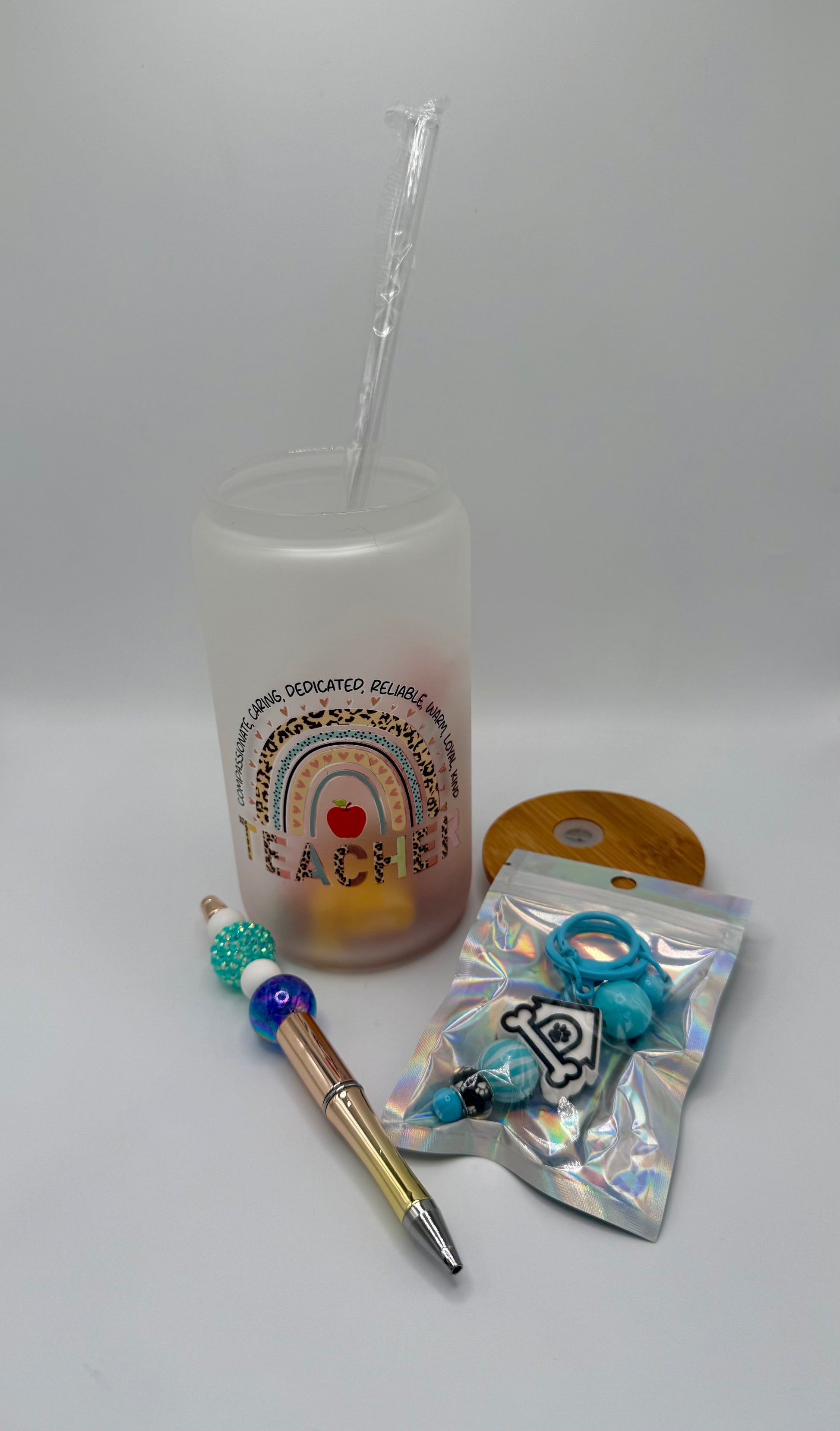 Celebrate the new school year with the Teacher Rainbow set, featuring a 16oz glass cup perfect for your favorite beverage, a charming dog house keychain, a practical pen, a fun straw, and a sweet candy treat. This collection is designed to inspire and support educators, combining everyday essentials with thoughtful touches to brighten their day. Ideal for back-to-school gifting, it blends functionality with motivation in a colorful, expert-curated package.